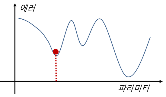 Local minima 문제는 에러를 최소화시키는 최적의 파라미터를 찾는 문제에 있어서 아래 그림처럼 파라미터 공간에 수많은 지역적인 홀(hole)들이 존재하여 이러한 local minima에 빠질 경우 전역적인 해(global minimum)를 찾기 힘들게 되는 문제를 말합니다.