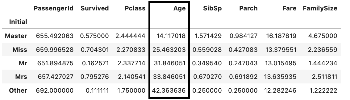 df_all의 나이 평균치를 확인하고 널값이면서 호칭별로 loc으로 indexing 해서 평균 나이를 사용하여 채워준다.